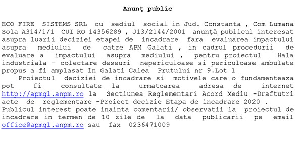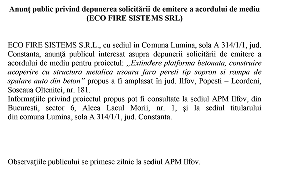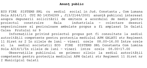 Operatiunile noastre sunt in deplina conformitate cu legislatia romaneasca si directivele Uniunii Europene. Efectuam periodic masuratori ale emisiilor si raportam rezultatele autoritatilor competente. Raportul de masuratori emisii la cos este disponibil pentru descarcare pe aceasta pagina.